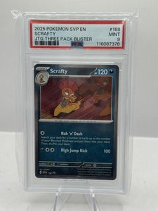 2025 Pokemon SVP EN JTG Three Pack Blister #188 Scrafty PSA 9
