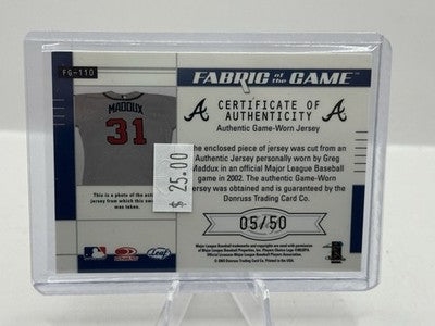 Greg Maddux Game-Worn Jersey Patch 05/50 2003 Leaf Certified Fabric of the Game #110 Atlanta Braves