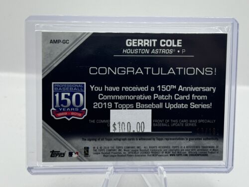2019 Topps Commemorative Patch 150th Anniversary Gerrit Cole Auto Houston Astros 10/10